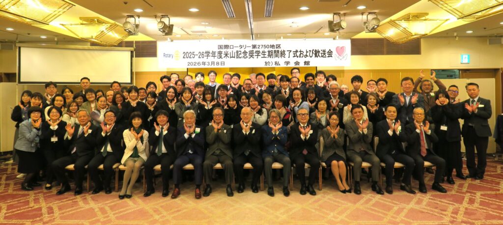 2026年3月8日(日)、国際ロータリー第2750地区の「2025-26学年度 米山記念奨学生 期間修了式および歓送会」が盛大に開催されました。当日は修了・継続奨学生34名、世話クラブ・カウンセラー35名、地区役員、学友会関係者など21名、計90名が出席しました。本行事は、米山奨学生としての期間を修了する留学生を送り出すとともに、奨学生・ロータリアン双方がその歩みを振り返り、今後の活躍を祝福する節目の式典です。