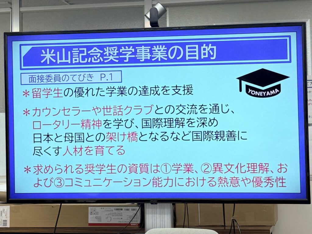 冒頭では、米山奨学会と2750地区における選考プロセスが改めて説明されました。6月の奨学会理事会による地区枠の決定、地区による指定校選定、大学側での学内選考を経て、12月に地区面接を実施します。
