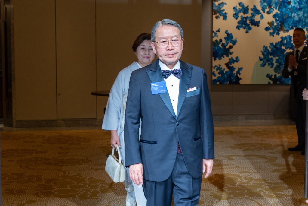 歓迎晩餐会は、田中ガバナーのご挨拶・ご来賓のご紹介、水野功RI理事のご挨拶の後、辰野克彦パストガバナーの乾杯で幕を開けました。会場前方のカーテンが開くと、全面ガラス張りの先に皇居の和田倉濠と夜景が浮かぶ荘厳な雰囲気の中、優雅で贅沢なひとときをお過ごしいただけたものと存じます。