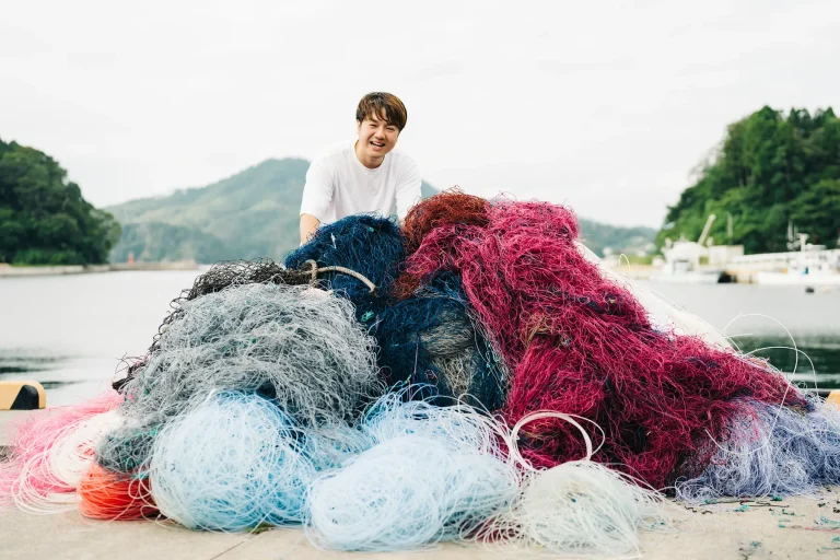 リサイクル原料となる廃漁具や、廃漁網由来マテリアルamuca®️を使ったオリジナルコレクション「Buddy Collection」の商品を展示します。