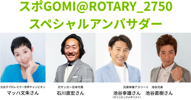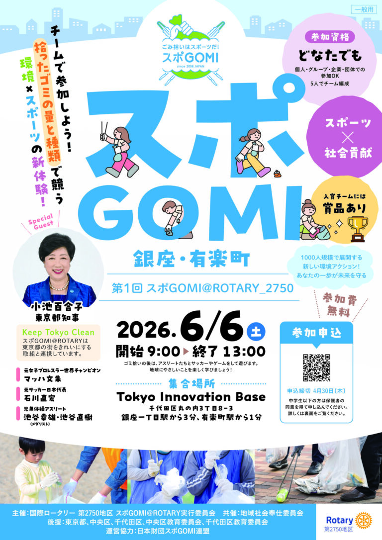 主 催:スポGOMI@ROTARY実行委員会(国際ロータリー第2750地区)共 催:地域社会奉仕委員会(国際ロータリー第2750地区)運営協力:⽇本財団スポGOMI連盟後 援:東京都・中央区・千代⽥区・中央区教育委員会・千代田区教育委員会